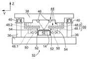 図3は、露光ステーション34の略側面図である。露光ステーション34は、ベース・フレーム36によって支持される。ベース・フレーム36はメトロ・フレーム38を搭載し、メトロ・フレーム38は、分離手段40によってベース・フレーム36から動的に分離される。投影システム18は、支持部材56(支持部材56は動的分離手段であってもよい)を介してメトロ・フレーム38によって支持される。この実施例では、メトロ・フレーム38は、位置センサ30を搭載する(干渉計48.1及び/又はエンコーダ・システム48.2、それによって、エンコーダ・システム48.2は、投影システム18用の切り取り部を備えることが留意される)。しかし、位置センサ30は、投影システム18によって(又は、等価的に、投影システム18に取り付けられたフレームによって)搭載されてもよいことが留意される。  FIG. 3 is a schematic side view of the