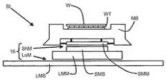 ストロークの長いモータLoMは、固定フレーム又はバランス・マス(図示せず)に取り付けることができる固定部分LMS及び固定部分に対して変位可能である非固定部分LMMを備える。ストロークの短いモータShMは、第1非固定部分SMS(ストロークの長いモータの非固定部分LMMに取り付けることができる)と第2非固定部分SMM(ミラー・ブロックMBに取り付けることができる)を備える。 The long stroke motor LoM comprises a fixed part LMS that can be attached to a fixed frame or balance mass (not shown) and an unfixed part LMM that is displaceable relative to the fixed part. The short-stroke motor ShM includes a first non-fixed portion SMS (which can be attached to the non-fixed portion LMM of the long-stroke motor) and a second non-fixed portion SMM (which can be attached to the mirror block MB).
