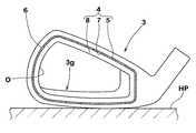 また衝撃吸収体6の長手方向と直角な断面積(凹部5の断面積)は、2.5〜24.0mm2に限定される。前記断面積が2.5mm2未満の場合、衝撃吸収効果が十分に得られない傾向があり、逆に24.0mm2を超える場合、トップ領域などに設けるのが困難になるばかりか、ヘッド本体3の強度を低下させる傾向があり好ましくない。特に好ましくは、衝撃吸収体6の前記断面積は、3.0mm2以上、さらに好ましくは4.0mm2以上が望ましく、上限については好ましくは24.0mm2以下、さらに好ましくは20.0mm2以下が望ましい。The cross-sectional area perpendicular to the longitudinal direction of the shock absorber 6 (the cross-sectional area of the recess 5) is limited to2.5 to 24.0 mm2 . The case the cross-sectional area is less than 2.5 mm2, there is a tendency for the shock absorbing effect is not sufficiently obtained, when it exceeds 24.0 mm2 in the opposite, not only it becomes difficult to provide a like top area, the head body No. 3 tends to decrease the strength, which is not preferable. Particularly preferably, the cross-sectional area of the