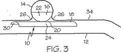 図3は、図2の血管閉塞装置10が配置後に動脈瘤14にて展開された様子を示す。この時点で、カテーテル配送装置15は、シート16及びシート18が配置されるように引き戻されている。カテーテル配送装置15が引き戻されると、シート16が最初に配置され、カテーテル配送装置がさらに引き戻されると、次いでシート18が解放される。引き込み可能なシースは随意に使用可能である。図3は、シート16及びシート18の両方が完全に配置及び展開された状態を示す。この実施形態において、シート18は、脈管障害物14が位置する血管壁34に対して凸となる矩形のシートの形状で示されている。シート18は、動脈瘤の頚部26に対しても凸となる。シート18の接触面24は、装置と患者の脈管構造との一体化を促進したり、動脈瘤をより迅速に治癒したりするための生体適合性材料を備えることが可能である。対向する非接触面30の一部が図3に明確に示されている。また、シート16の接触面22も、装置と患者の脈管構造との一体化を促進したり、動脈瘤をより迅速に治癒したりするための生体適合性材料を備えることが可能である。  FIG. 3 shows the