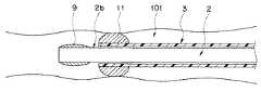 その方法としては、まず、図10に示すように、内視鏡用バルーン9およびオーバーチューブ用バルーン11を十分収縮させた状態で、術者は、挿入部2bの先端部を生体内である腸管101に挿入する。次に、挿入部2bの挿入が困難な部位にさしかかった場合、術者は、リモートコントローラ8に設けられた図示しないスイッチを操作し、内視鏡バルーン制御装置7に対し、オーバーチューブ用バルーン11を拡張させるための信号を送信する。その信号を受信した内視鏡バルーン制御装置7は、オーバーチューブ用バルーン送気チューブ14と、空気供給チューブ12とを介してオーバーチューブ用バルーン11に空気を送気し、図11に示すように、オーバーチューブ用バルーン11を拡張させる。その後、オーバーチューブ3が、オーバーチューブ用バルーン11により腸管101の外周部である腸壁102で固定されている該状態において、図12に示すように、術者は、挿入部2bのみをオーバーチューブ用バルーン11からスライドさせて、所定の距離前進させる。挿入部2bを該所定の距離だけ前進させた場合において、術者は、リモートコントローラ8に設けられた図示しないスイッチを操作し、内視鏡バルーン制御装置7に対し、内視鏡用バルーン9を拡張させるための信号を送信する。その信号を受信した内視鏡バルーン制御装置7は、オーバーチューブ用バルーン送気チューブ13と、空気供給チューブ10とを介して内視鏡用バルーン9に空気を送気し、図13に示すように、内視鏡用バルーン9を拡張させる。内視鏡用バルーン9が所定の大きさまで拡張した後、術者は、今度はリモートコントローラ8に設けられた図示しないスイッチを操作し、内視鏡バルーン制御装置7に対し、オーバーチューブ用バルーン11を収縮させるための信号を送信する。その信号を受信した内視鏡バルーン制御装置7は、装置内部に設けられた図示しない管路の一部を開放することで、前記操作によってオーバーチューブ用バルーン11に送気した空気を装置外部に放出し、図14に示すように、オーバーチューブ用バルーン11を収縮させる。その後、挿入部2bが内視鏡用バルーン9により腸壁102で固定されている該状態において、図15に示すように、術者は、挿入部2bを前進させた前記所定の距離だけオーバーチューブ3を前進させる。さらに深部に挿入部2bを前進させたい場合には、図16に示すように、術者は、再びオーバーチューブ用バルーン11を拡張させ、オーバーチューブ3を腸壁102に固定させた上で、リモートコントローラ8に設けられた図示しないスイッチを操作し、内視鏡用バルーン9を収縮させて図11の状態とする。これ以降は、図11から図16を参照しつつ説明を行った前記の方法を繰り返し行うことで、挿入部2bを深部に前進させることができる。  As the method, first, as shown in FIG. 10, in a state where the