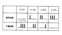 図3に示した運用波長テーブルは、各光分岐挿入ノード101(ノード1〜ノード4)における現用回線100と予備回線110を伝送する波長ごとの光信号の状態を表している。波長番号1〜4は、WDM信号の多重化されたλ1〜λ4の光信号を指す。各波長番号の運用情報は、通常1か0で示され、「1:運用中」、「0:非運用中」を表す。例えば、図3中の301で指し示した情報は、光分岐挿入ノード101(ノード1)における現用回線100を伝送するWDM信号中のλ4の光信号が、通信用として運用中であるか否かを表している。同様に302で指し示した情報は、光分岐挿入ノード101(ノード3)における予備回線110を伝送するWDM信号中のλ2の光信号が、通信用として運用中であるか否かを表している。基本的に現用回線100と予備回線110は同一のWDM信号を伝送しているため、通常時は、同一の光分岐挿入ノード101であれば、現用回線100と予備回線110の運用波長テーブルの情報は同一となる。  The operational wavelength table shown in FIG. 3 represents the state of the optical signal for each wavelength transmitted through the working