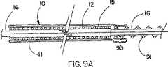 図9、図9A及び図9Bは、拘束シース11が、ハブ端部からエンドプロテーゼの先端部まで及ぶ外転管状コンポーネントの形である、別の実施態様に関する縦断面である。次いで、拘束シース11はそれ自体に関して後方へ伸び、ハブ端部、及び、シース11のハブ端部が弾性又は非弾性材料のどちらかであるカテーテルシャフトなどの別のコンポーネント、あるいはまたスプリングコンポーネントに接合している付着領域93まで達する。図9Aの拡大図は、外転拘束シース11のハブ端部が付着しているコイルスプリングコンポーネント91を表わすが、所望とされる場合には、コイルスプリングコンポーネントは、シリコーンなどの弾性材料、又は、ポリエチレンなどの非弾性材料のどちらかのチューブ又は繊維に取り替えることができる。図9Aは、展開に先立ち、コイルスプリングコンポーネントが現れるようなこの実施態様を示す。スプリングコンポーネント91は張力をかけた状態で拘束シース11に付着しているが、スプリング張力は十分に低いので、シース11は、身体導管20への挿入の間、エンドプロテーゼ12から離れない(ここでは示されない)。図9Bは、部分的に展開した系を表わし、外転している拘束シースは、それがカテーテルハブの方へ回収されるようにさらに外転する。シースがさらに外転すると、スプリング91の張力により補助されたバルーン15の膨張によって、シース11の内部からエンドプロテーゼが解放され展開する。シース11の完全な外転、並びに、エンドプロテーゼ12の完全な解放及び展開に続いて、該シースはカテーテル16とともに身体導管20の内部から取り除かれる。  9, 9A and 9B are longitudinal sections for another embodiment in which the constraining