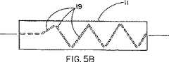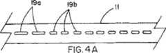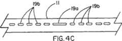 穿孔19は、穿孔ラインに沿ったシースの断裂が容易に制御できるので、拘束シースを崩壊させる好ましい方法である。該穿孔は形状を変えることができ(例えば、開口の長さ、幅、間隔、又は、実際の形状)、又は、直線以外のさまざまなパターンに配列することができる。例えば、シースの特定端部など、シースの特定位置で崩壊を開始させることが望まれる場合、個々の穿孔は異なる形状を備えることができる。図4A〜図4Cは、崩壊が始まる場所を制御することを意図したさまざまな穿孔の配列を表わす。図4Aは、より長い穿孔19aを有する端部で崩壊を開始させるために、シース11の特定端部がより長い穿孔19aを備え、一方で、残りの長さがより短い穿孔19bを備える配列を示す。図4Bにおいては、崩壊はより長い穿孔19aの位置によって示されるどちらかの端部で開始させることができる。図4Cは、長さの中間で崩壊が始まるように、より長い穿孔19aがシース11の長さの中間に提供される実施態様を表わす。図4Dは、シース11の特定端部から反対側の端部まで崩壊が進行するように、非対称形状の穿孔19cが提供される、さらに別の可能性を示す。