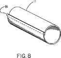 図8は、シースが管形状を形成するよう巻いたシートから作製され、反対の縁と縁の接合から生じる継ぎ目線81を備える、拘束シースのさらに別の実施態様を表わす。該縁は、境を接して、又は、より好ましくは、図8に示すように重ね合わせて接合することができる。該縁は、接着剤の使用を含めたさまざまな方法の何れかによって、又は、シース材料若しくは溶解可能な接着剤のどちらかを溶融結合させることによって接合される。ePTFEの拘束シースで使用する適切な溶解可能な接着剤はFEPである。該接合は、シースを含んで成る材料の残りの部分よりも壊れやすい継ぎ目となる方法において達成され、そのために、カテーテルバルーンの膨張によってかけられるような円周方向力の適用下で、継ぎ目が崩壊し、それによって、自己延伸膨張又はさらなるバルーン延伸膨張によってと同様に展開のためのステントを解放する。  FIG. 8 represents yet another embodiment of a constraining sheath, wherein the sheath is made from a rolled sheet to form a tube shape, with