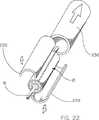 図22は、ハーフ220を解放するまで、外部シース230を軸方向にスライドさせることによる外部シース230の除去を表わす分解斜視図である。次いで、ハーフ220が解体され、本発明の拘束シースアッセンブリ10をさらす。この構成は、展開バルーンに関して、拘束シースアッセンブリ10が軸移動することを防止する助けとなる。  FIG. 22 is an exploded perspective view representing removal of the