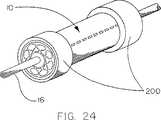 図23A〜図23Cは、“オープンメッシュ”チューブが本発明の拘束シースアッセンブリ10を包装して拘束するのに使用される、包装シース200のさらに他の構成の斜視図である。包装シース200としての開口を具備する管状デバイスを利用することは、包装プロセスに先立ち、拘束シースアッセンブリ10の目視検査をでき、消毒の助けとなることもできるという点で有利である。この“オープンメッシュ”は、編み組みした、編んだ、若しくは、織った、金属若しくは高分子のフィラメント又はそれらの組み合せと同様に、機械加工された、打ち抜かれた、又は、エッチングされたチューブで構成することができ、拘束シースアッセンブリ10から離れてオープンメッシュをスライドさせること、オープンメッシュを直径に沿って拡張するように包装シース200を軸方向に短くすること、若しくは、引っ張りコード240に張力をかけることで可能な編みを解く方法、又は、それらの組み合せによって取り除くことができる。図23Cにおける、このような編みの解ける管状のニット編み(knit-braid)デバイスはArmstrongらに対する米国特許第6,224,627号明細書に説明されている。  23A-23C are perspective views of yet another configuration of a