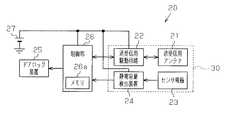 コイル32の両端部から延びる導線33,34は前記送受信用駆動回路22に接続されている。前記静電容量検出装置24から延びる導線35は、コイル32と送受信用駆動回路22との間を延びる両導線33,34のうちの一方、すなわち導線33に接続されている。よって、静電容量検出装置24は、導線35及び導線33を介してコイル32に電気的に接続されている。従って、静電容量検出装置24は、コイル32と前記センサ電極23との間に生じる寄生容量C1によって、センサ電極23と交流的に接続される。