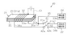 スイッチ41は、コイル32の一端から延びる前記導線33aに接続された可動端子41aと、送受信用駆動回路22から延びる導線33bに接続された接点41bとを含む。また、スイッチ42は、コイル32の他端から延びる導線34aに接続された可動端子42aと、送受信用駆動回路22から延びる導線34bに接続された接点42bとを含む。可動端子41a,42aの動作は制御部26によって制御される。即ち、制御部26は、送受信用駆動回路22を駆動させる際には、スイッチ41,42を閉路(オン)する。また、制御部26は、静電容量検出装置24を駆動させる際には、スイッチ41,42を開路(オフ)する。  The