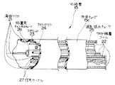 図2に示すように可撓管15は、最内層側より、薄い帯状の金属片を螺旋状に巻いて形成した螺旋管15aと、金属素線又は非金属素線を編み込んだ網状管15bと、樹脂材料で形成した外皮層である外皮チューブ15cとを積層してチューブ状に構成され、内部には図3に示す各種内蔵物が挿通している。