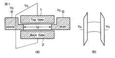 ダブルゲート型MOSFETでは、図1(a)で示されているように、トップゲート(もしくは、フロントゲートと呼ぶ)電極1とバックゲート電極2に同時に同じ電圧を印加する。このため、図1(b)に示すように、チャネルに垂直な方向で切った断面でのポテンシャルを見ると、両側のゲート電極でフェルミ準位が引っ張られて、両方の側面の表面部にチャネルが形成されるのがわかる。通常、FinFETと呼ばれるトランジスタは、両側のゲート電極に同時に等しい電位を与えるような構造となっており、狭義のダブルゲート型トランジスタとなっている。  In the double gate type MOSFET, the same voltage is simultaneously applied to the top gate (or front gate)