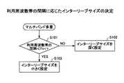 図5は、マルチバンド多重を行う際のインターリーブ制御のフローチャートである。周波数・送信電力割当部106が1人のユーザ、あるいはひとつのアプリケーションの実行)に対して複数の周波数帯を割り当てた場合(マルチバンド多重)、送信パラメータ決定部111は、割り当てられた周波数帯の間隔がインターリーブ処理に関する所定の間隔Fth1よりも広いか否かを判断する(S101)。利用周波数帯の間隔が所定の間隔Fth1よりも狭い場合は(S101でNO)、周波数帯ごとにフェージング変動の相関が高いため、ランダム化のためにインターリーブサイズを大きく(深く)して、誤りの低減をはかる(S102)。逆に、利用周波数帯の間隔が離れているときは(S101でYES)、それぞれの周波数帯の相関が低いため、一括してインターリーブを浅くしてもビット誤りのランダム化に効果があるので、インターリーブサイズを小さく設定して処理遅延を低減する(S103)。  FIG. 5 is a flowchart of interleaving control when performing multiband multiplexing. When the frequency / transmission