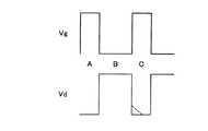 インバータ回路用の絶縁ゲート型半導体装置では,一般的に,ゲート電圧(Vg)がオンオフされると,図26の実線に示すようにドレイン電圧(Vd)が変化する。すなわち,Vgがオンした状態(図26中のA)では,空乏層が広がっていないため,低オン抵抗の状態で動作する。そして,Vgがオフしている間(図26中のB)は,空乏層が広がった状態(高オン抵抗の状態)となり,Vdが高い状態になる。すなわち,空乏層によってドレイン−ソース間の耐圧を保持する状態となる。そして,Vgを再度オンする(図26中のC)と,再び空乏層が狭くなる。そして,低オン抵抗の状態で動作する。 In an insulated gate semiconductor device for an inverter circuit, generally, when the gate voltage (Vg) is turned on / off, the drain voltage (Vd) changes as shown by the solid line in FIG. That is, in a state where Vg is turned on (A in FIG. 26), the depletion layer is not spread, and thus the operation is performed in a low on-resistance state. While Vg is turned off (B in FIG. 26), the depletion layer is expanded (high on-resistance state), and Vd is high. That is, the breakdown voltage between the drain and the source is maintained by the depletion layer. When Vg is turned on again (C in FIG. 26), the depletion layer becomes narrow again. And it operates in a low on-resistance state.