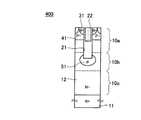 半導体装置410では,エピタキシャル層10の濃度の変化が始まる位置,すなわち高濃度層10bと中間層10dとの境界が,P拡散領域51の下端からP拡散領域51の上端までの間とする。なお,エピタキシャル層10の比抵抗の変化がP拡散領域51の下端付近から始まる半導体装置411を図20に,エピタキシャル層10の比抵抗の変化がP拡散領域51の上端付近から始まる半導体装置412を図21に,それぞれ示す。  In the