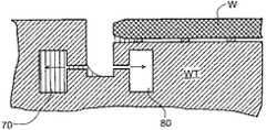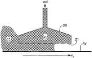 このタイプの抽出装置は、リソグラフィ装置の任意の所望の部分から液体またはガスを選択的に除去するために使用することができる。図20a〜dは、特に有利な使用方法を示す。この場合、液体抽出チャネル70およびガス抽出チャネル80は、両方とも、基板Wの縁部の周囲の基板テーブルWTのトレンチに接続している。基板の縁部が投影レンズの下に位置する場合、すなわちトレンチが液体で満たされている場合には、チャネル70は液体を抽出し、そのため液体は下方に流れる。これにより、例えば、不完全な充填により、トレンチ内に位置するすべての泡が下方に吸い取られる。これにより泡はある位置に送られ、そこでチャネル80を介してガスを抽出することができるが、泡はチャネル70には入らない。基板の縁部がもはや投影レンズの下に位置していない場合には、トレンチは急速に空になる。このようにして、泡の流出が画像形成の干渉するのが防止される。液体の流れとガスの流れとを分離することにより、振動を起こす恐れがある不安定な状況を避けることができ、蒸発による冷却効果を最小限度に低減することができる。  This type of extraction apparatus can be used to selectively remove liquids or gases from any desired portion of the lithographic apparatus. Figures 20a-d show a particularly advantageous method of use. In this case, the