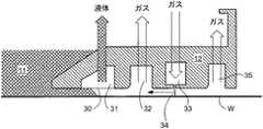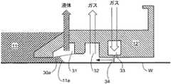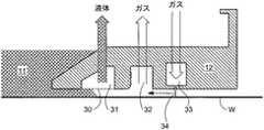 図10および図11に示す変形例の場合には、鋭角のコーナー35は、鋭角のコーナーのところの表面張力により保持されるメニスカス11aの位置を制限するために使用される。鋭角のコーナーは、図10に示すように鈍角であってもよいし、図11に示すように直角であってもよい。ガス抽出リング32の形は必要に応じて調整することができる。  In the case of the variant shown in FIGS. 10 and 11, the