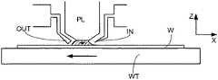 図4は、局在化液体供給システムによるもう1つの浸漬リソグラフィ解決方法を示す。液体は、投影システムPLのどちらかの側上の2つの溝入口INを通して供給され、入口INの外側に半径方向に配置されている複数の個々の出口OUTを通して除去される。入り口INおよび出口OUTは、その中央に孔部を有し、投影ビームが投影される1つの平面内に配置することができる。液体は投影システムPLの一方の側上の1つの溝入口INを通して供給され、投影システムPLの他方の側上の複数の個々の出口OUTを通して除去され、投影システムPLと基板Wとの間に液体の薄いフィルムの流れを形成する。入口INおよび出口OUTを使用するための組合わせの選択は、基板Wの運動方向により異なる(入口INおよび出口OUTの他の組合わせは作動しない)。 FIG. 4 shows another immersion lithography solution with a localized liquid supply system. Liquid is supplied through two groove inlets IN on either side of the projection system PL and removed through a plurality of individual outlets OUT arranged radially outside the inlet IN. The inlet IN and the outlet OUT have a hole in the center thereof, and can be arranged in one plane on which the projection beam is projected. Liquid is supplied through one groove inlet IN on one side of the projection system PL, removed through a plurality of individual outlets OUT on the other side of the projection system PL, and liquid between the projection system PL and the substrate W. Form a thin film stream. The choice of combination for using the inlet IN and outlet OUT depends on the direction of motion of the substrate W (other combinations of inlet IN and outlet OUT do not work).