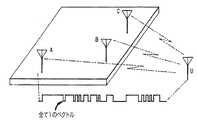 移動加入者局アンテナ10(この明細書では、ユーザ端末アンテナ、加入者局アンテナ、または単にアンテナUともいう)をアンテナA、BおよびCに双方向無線リンクで結合する。CDMA転送局14は適宜切換えを経てアンテナT経由の双方向無線リンクで公衆通信用電話交換網に結合される。  A mobile subscriber station antenna 10 (herein also referred to as a user terminal antenna, subscriber station antenna, or simply antenna U) is coupled to antennas A, B and C via a bi-directional radio link. The