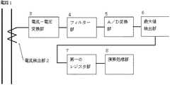 図1に本件発明請求項1の実施例のブロック図を示す。電流検出部2と、電流−電圧変換部3と、フィルター部4と、A/D変換部5と、最大値検出部6と、第一のレジスタ部7と、演算処理部8を組み合わせて構成したものである。