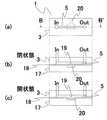 図17は、本発明の第8の実施例のマイクロバルブ機構1を示した図であり、図17(a)はマイクロバルブ機構1を上方から見た平面図、図17(b)は図17(a)のB−B’線におけるバルブ閉状態の断面図、図17(c)は図17(a)のB−B’線におけるバルブ開状態の断面図を示している。図18は図17のバルブ領域AのC−C’線における断面図である。図18(a)はバルブ閉状態における断面図を示し、図18(b)はバルブ開状態における断面図を示している。また、図19は図17のバルブ領域Aにおける斜視図である。  FIGS. 17A and 17B are views showing amicrovalve mechanism 1 according to an eighth embodiment of the present invention. FIG. 17A is a plan view of themicrovalve mechanism 1 as viewed from above, and FIG. FIG. 17C is a cross-sectional view of the valve closed state along the line BB ′ in FIG. 17A, and FIG. 17C is a cross-sectional view of the valve open state along the line BB ′ in FIG. 18 is a cross-sectional view taken along line C-C ′ of the valve region A in FIG. 17. FIG. 18A shows a cross-sectional view in the valve closed state, and FIG. 18B shows a cross-sectional view in the valve open state. FIG. 19 is a perspective view of the valve region A of FIG.