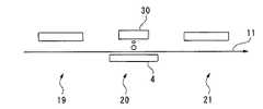 ここで、リールツーリール方式では、複数の処理空間にわたってテープ状基板11(帯状基板)が配されるから、その基板11に沿って互いに隣接する処理空間の間をガスが移動したり、基板11に反射した光が隣りの空間に入射したりする可能性がある。本例のシステムでは、上記処理タイミングの制御によって、液体材料の配置の間は、隣接空間での所定処理が行われないことから、前処理装置19及び膜硬化装置21が光処理または熱処理を行う場合にもその光影響または熱影響が液滴吐出装置20の処理空間に及ぶのが防止される。その結果、液滴吐出装置20の処理空間において精度よく液滴吐出が実施され、配線パターンを正確に形成することができる。  Here, in the reel-to-reel method, since the tape-like substrate 11 (band-like substrate) is arranged over a plurality of processing spaces, the gas moves between the processing spaces adjacent to each other along the