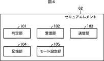 図4は、セキュアエレメント62の一実施の形態の機能的構成を表している。セキュアエレメント62は、判定部101、受信部102、送信部103、記憶部104、およびモード設定部105を有している。  FIG. 4 shows a functional configuration of an embodiment of the