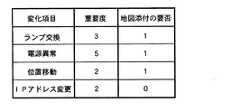 重要度/地図添付要否テーブルには、プロジェクタ装置1から電子メールで通知されうる変化項目毎に、重要度を示す数値データと地図添付の要否データとが格納されている。地図添付の要否データは、1または0からなり、1は地図添付が必要なことを示し、0は地図添付が不要なことを示している。  In the importance / map attachment necessity table, numerical data indicating importance and map attachment necessity data are stored for each change item that can be notified by e-mail from the