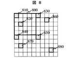 図8は、領域120,130の背景パターンの他の例の説明図である。図8では、塗潰し領域を5ドット×5ドットの四角800に分割し、そのマトリックスの左上の画素(810,830,840,850)が16進コードの分割基準点として必ず塗潰されるものとする。そして,四角800内の右下の16ドットを前述の4×4の四角に対応させる。このようにすると、文字列の情報は画素820,860,870,880のように無秩序に分布することになるが、基準点である画素810,830,840,850は規則的に配列される為、データの検出が容易になる。  FIG. 8 is an explanatory diagram of another example of the background pattern of the