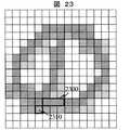 偽造の一例を示す。図23は文字「の」の一部を改竄したものであり、例えば領域2300を塗潰して、文字を偽造している。この文字に関して図18のルールを適用すると、ドット2310は色1840で塗潰される。そして、ボロノイ図で表現された領域の塗りわけを行なったものが図24である。図22では、ドット2230とドット2250は同じ色であり、境界線2270の両側が同じ色1850で塗潰される。一方,図24では、ドット2430とドット2450が異なるから、境界線の左側が色1840、右側が色1850となる。したがって、図22と図24の違いが目視でも判別できる。このような色の変化は、文字の形の一部を改竄した場合だけでなく、位置を少しずらしただけでも起こりうる。  An example of forgery is shown. In FIG. 23, a part of the character “NO” is falsified. For example, the