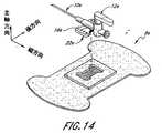 粘着性部材24は、望ましくは固定器具8とカテーテル取付け具12との間の相対運動を抑制するためにカテーテル取付け具12を固定する及び/又は(少なくともある程度)被包するために十分な厚さ及び粘着性を有する。粘着性部材24は、例えばトランスファー・テクノロジー(例、薄膜トランスファー・テープ)又はスパッタリングのような様々な従来型方法のいずれかで固定器具8に適用することができる。例えば、図示された実施態様では、粘着性部材24はMinnesota  Minning  and  Manufacturing  Company(3M社)(ミネアポリス、ミネソタ州)から製品番号950として入手可能なトランスファー接着剤から形成される。