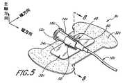 ここに開示されている固定器具と保持装置の構成部分の説明を補助するために、下記の座標用語が使用されている。縦軸は、固定器具によって保持される医療用ラインの部分に概して平行であり、概して固定器具のベース若しくはパッドの平面にある(下記で説明される)。横軸は、ベースの平面内の縦軸に概して垂直である。主軸は縦軸及び横軸の両方を横断して伸張している。図1では固定器具の側に座標系が示されている。図示された座標系は、ここで図示される好ましい実施態様各々の透視図に適用される。さらに、ここで使用される「縦方向」とは縦軸に実質的に平行な方向を意味する。「横方向」とは横軸に実質的に平行な方向を意味する。さらに、「主軸方向」とは主軸に実質的に平行な方向を意味する。これらの座標は各実施態様の固定器具の構造及び運動を説明するために使用される。各実施態様の詳細な説明及びその関連使用方法は下記に記載されている。