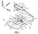 図1及び2に明らかなように図示された実施態様では、固定器具8は柔軟性アンカー・パッド32上に取り付けられていて概して参照番号30が指定されている保持装置を含む。保持装置30には、位置決め機構(例、ポスト28)及び保持装置30の粘着性部材24を支持するベース34が含まれる。ベース34は、望ましくはカテーテル取付け具12に対する受入れ面(概して参照番号36が指定されている)の範囲を部分的に規定する平面形を有する。ポスト28は概して通常は受入れ面36上のポスト28間に配置された粘着性部材24と一緒にベース34の受入れ面36へ伸張している。
