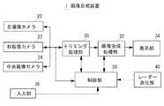 制御部38は、例えば、ROM、RAM等を含むマイクロコンピュータ等から構成され、画像合成に必要な処理プログラムやデータをROM、RAMに格納している。制御部38は、トリミング処理部30に対して、撮像された画像データについてどの領域をトリミングするかの指示を与えたり、画像合成処理部32に対して、どの画像データを合成すべきかの指示を与える。さらに、制御部38は、撮像カメラからの画像データに基づき、車両後方に位置する物体までの距離を算出する。距離の算出は、例えば、左右の撮像カメラ20、22(ステレオカメラ)により撮像された画像データにおける物体との成す角度により物体までの距離を算出する。さらに、図1に示すようにレーダー測位部40を設け、ミリ波レーダー等により後方の物体までの距離を測位するようにしてもよい。  The