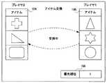 図5に戻って、順位表示部100において優先順位が第1位であるプレイヤ2の部分には、親機がそのプレイヤ2の子機と現在通信ゲーム中であることを示すアイコン102が表示される。また、このゲーム画面の左右両端部には、自機のプレイヤの所持するアイテムを表示するアイテム表示部104と、通信相手機のプレイヤの所持するアイテムを表示するアイテム表示部106とがそれぞれ設けられる。つまり、左側のアイテム表示部104には、親機のプレイヤ1の所持アイテムのうち選択された3つが表示され、右側のアイテム表示部106には、現在通信ゲーム中の子機のプレイヤ2の所持アイテムのうち選択された3つが表示される。プレイヤは、たとえば方向スイッチ26aを操作して、アイテム表示部に表示されるアイテムをスクロールによって変更することができる。この実施例では、アイテム表示部104および106の中央に表示されているアイテムが、交換の対象とされる。プレイヤは、所定の操作スイッチ26(たとえばAボタン26b)を操作することで、通信相手と交換する自己のアイテムを決定する。両方のプレイヤが所定の操作スイッチ26を操作した場合にアイテムの交換が行われる。この図5の例では、アイテムが交換中であることが示されている。なお、アイテム表示部106に表示される通信相手の所持アイテムに関する情報や、通信相手が交換するアイテムを決定したことを示す情報などは、通信相手である子機から送信される。  Returning to FIG. 5, an
