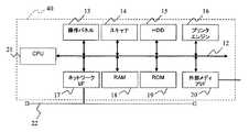 図3は、本実施の形態における複合機40のハードウェア構成図である。複合機40は、上記の通りコピー機能、スキャナ機能等各種機能を搭載した複合機であり、コンピュータを内蔵した装置である。図3において、CPU21は、ROM19に格納されたプログラムにしたがってスキャナ14やプリンタエンジン16等複合機40に搭載された各種機構の動作制御を行う。アドレスデータバス12は、CPU21の制御対象となる各種機構と接続してデータの通信を行う。操作パネル13は、ユーザからの指示の受け付け、情報の表示を行う。スキャナ14は、ユーザがセットした原稿を読み取り、電子データとしてHDD15等に蓄積する。HDD15は、スキャナ14を使用して読み取った電子文書などを格納する。親展ボックスもHDD15に設けられる。プリンタエンジン16は、CPU21で実行される制御プログラムからの指示に従い出力用紙上に画像を印字する。ネットワークインタフェース(I/F)17は、LAN22を接続し、複合機40が生成した電子データの送信、複合機40宛に送信されてきた電子メールの受信、またブラウザ経由による複合機40へのアクセスなどに利用される。RAM18は、プログラム実行時のワークメモリや電子データ送受信時の通信バッファとして利用される。ROM19は、複合機40の制御や電子データの暗号、電子データの送受信に関する各種プログラムが格納されている。各種プログラムが実行されることで後述する各構成要素が所定の処理機能を発揮する。外部メディアインタフェース(I/F)20は、USBメモリ、フラッシュメモリ等の外部メモリ機器とのインタフェースである。  FIG. 3 is a hardware configuration diagram of the