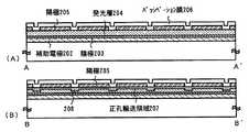 本実施形態について、図2を用いて説明する。まず、基板201上に補助電極202と陰極203とを形成する。このとき、マスクを用いた蒸着法若しくはスパッタ法により選択的且つ連続的に積層する。図2(A)では示されないが、紙面に対して奥手方向に長いストライプ状の複数の電極を形成する。