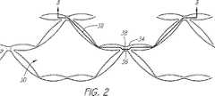 本発明によってステントに提供されるセルは、多数の異なる形態をとり得る。例えば、1998年11月16日に出願された出願番号09/192,977(その開示は明白に本明細書中に参考として援用される)は、このような多数の配置を開示する。特に図2を参照すると、このような複数セルのメッシュ構造の好ましい実施形態は、弓型の形状を有する実質的に対角の要素32を備える、複数のセル30を備えることが示される。各列または円筒形バンドにおいて、全ての弓型形状の対角要素32は、好ましくは、同じ方向に配向する。すなわち、周囲の周りで「時計回り」または「反時計回り」のいずれかの方向である。この特徴は、対各要素32の互いとの「充填」を容易にし得る(すなわち、対角要素の重なりを引き起こすことなく、コイル状シートステント10をその未伸長状態に圧縮するため)。より特定すると、ステント10の全てのセルにおける対角要素32の全てが、好ましくは、図4に見られるように、時計回りに配向する。従って、下にある対角要素32の正確な位置は、上にある対角要素32から離れて配向し得、このことは、内側セクションおよび外側セクションのスライドを容易にし、そして拡張の間に、下にある対角要素が上にある対角要素を捕捉する可能性を低下させる。