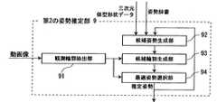 姿勢推定部2は動画像撮影部1で取得された動画像中の現在のフレームの画像から試着者の特徴を求める。姿勢推定部2はこの試着者の特徴と姿勢辞書Bと三次元体型形状データAとを用いて現在のフレームに対応する時刻の前記試着者の姿勢を推定する。  The posture estimation unit 2 obtains the characteristics of the try-on person from the current frame image in the moving image acquired by the moving