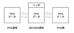 携帯電話(101)のPHS無線データは、無線通信装置(111)によってヘッダがつけられ、IMT2000(112)上のデータ形式に変換され、その後、IMT2000網(114)によってヘッダ部分が取り除かれ、PHSのデータ形式でPHS網(115)に伝送される。