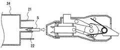 上述した穿刺動作を終えた状態で、穿刺器具1の穿刺針装填口9側を、穿刺針カートリッジ18の穿刺器具ガイド部21へ差し込む。このとき、穿刺器具ガイド部21内に配設された内側円筒部23の先端部にある穿刺針抜き取りツメ22が、穿刺針5のクビレ部5bに入り込む動作を行うと同時に、穿刺針抜き取りツメ22を持つ内側円筒部23の先端が、穿刺針保持ロッド4の先端部にある穿刺針保持ツメ26を、図6(a)のように外側へ押し広げる動作を行い、これにより、穿刺針5自体は、内側円筒部23へ取り込まれることになる(図6(b))。その後、穿刺器具1を引き抜くことによって、使用済みの穿刺針5を、上記穿刺針カートリッジ18内に把持させることができる。そののち、このように上記穿刺針カートリッジ18に把持された1回前の使用済み穿刺針5を、穿刺器具1で保持している次の使用済み穿刺針5で押し込むことにより、該1回前の使用済み穿刺針5を、穿刺針カートリッジ18の廃棄ボックス部24内に落下させるとともに、前記次の使用済み穿刺針5を、上記穿刺針カートリッジ18の内側円筒部23に把持させることができる。そして、これをつぎつぎと繰り返すことにより、使用済み穿刺針5を穿刺針カートリッジ18内に廃棄し、該カートリッジ18のすべての穿刺針を使用したのち、それを該カートリッジ18内、あるいはその内側円筒部23内に連続的に廃棄、あるいは把持させたのち、該カートリッジ18自体を廃棄することができる。Next, the operation of discarding the