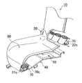 シートフレーム20は、図2に示したように、シートクッション部を形成するためのクッション用メインフレーム21及びシートバック部を形成するためのバック用メインフレーム22とを有して構成される。いずれもパイプ状のフレーム材からなり、クッション用メインフレーム21においては、このフレーム材を略コ字状に曲成して閉塞側が前方となるように配置している。バック用メインフレーム22においては、略方形に曲成すると共に、その上部には幅の狭い頭部支持用フレーム部22dを形成している。