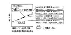 また、コントラストを算出する際に視野内でのコントラスト分布をより詳細に抽出できるように視野内の均等な位置でのコントラスト算出を可能とするため、図11に示すように複数の出力平均値から曲線多項式を補間により全センサ画素の出力平均値を算出(ステップ309)の後に、この全センサ画素の出力平均値を用いて、入射光量が最も明るいときの出力平均値と入射光量が他のときのパターン間隔毎の出力平均値からコントラストを算出し(ステップ306)、また、コントラストが目標コントラストとなる出力平均値の補正値を算出(ステップ308)しても良い。また、図12に示すように、補正目標値312をGUI等の外部入力手段によりパラメータとして与えても良い。補正目標値312はセンサ画素毎に異なる値でも良く、全センサ画素で同じ値でも良い。さらに、別の検査装置のセンサ画素毎の補正後の値を補正目標値312として与えることで、複数の検査装置間のセンサ画素毎のコントラスト差を無くし、検査装置間で視野内での各位置の検出感度特性の合わせ込みを行っても良い。また、図13に示すように、補正目標値312をGUI等の外部入力手段によりパラメータとして与えてステップ308にて、コントラストが目標コントラストとなる出力平均値の補正値を算出する際に、ステップ309で算出した複数の出力平均値から曲線多項式を補間により全センサ画素の出力平均値を使用しても良い。  Further, in order to enable the contrast calculation at an equal position in the field of view so that the contrast distribution in the field of view can be extracted in more detail when calculating the contrast, as shown in FIG. After calculating the output average value of all the sensor pixels by interpolating the curve polynomial (step 309), using the output average value of all the sensor pixels, the output average value when the incident light amount is the brightest and the incident light amount other than The contrast may be calculated from the output average value for each pattern interval (step 306), or the correction value of the output average value at which the contrast becomes the target contrast may be calculated (step 308). Further, as shown in FIG. 12, the