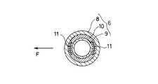図2に示す防振機構6は、外筒8と内筒9との間に同心状に挟まれた制振材料10の中に、車両進行方向Fの前側に位置する箇所と後側に位置する箇所とに、それぞれ剛性片11,11を軸方向に延長するように挿入したものである。剛性片11は、制振材料10よりも剛性の大きいものであればよく、例えば、金属板、セラミック板、樹脂板などが使用可能である。この剛性片11の挿入により、防振機構6は車軸3に直交する前後方向への可動変位量が小さくなり、操縦安定を向上することができる。