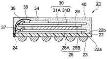 半導体素子26、31、34が実装された配線基板22の第2の主面22bには、例えばエポキシ樹脂からなる樹脂封止部40がモールド成形されている。半導体素子26、31、34は、金属ワイヤ37、38、39等と共に樹脂封止部40で一体的に封止されている。これらによって、BGAやLGA等として用いられる片面積層構造の半導体パッケージ21が構成されている。第2の実施形態の半導体パッケージ21は、半導体メモリ素子を多段に積層して高容量化を図った半導体記憶装置に好適である。  A