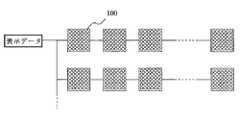 このような、多色、単色等、異なる種類のLEDユニットを組み合わせたLED表示装置は、例えば図7にマルチカラーと単色のLEDユニットを組み合わせたものを示すように、各種類のLEDユニットごとに1系統のデータバスラインを設けるのが最も一般的であった。しかし、図7に観るように、その様な方法では、LED表示装置の表現形態にある種の制限が加わったり、各LEDユニットを繋ぐ、ケーブルの長さが長くなり、駆動周波数に制限が加わったりする。