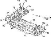 担架12は、その上に乗せた患者の状態を監視しかつ患者に応答するための装置を備えた当業界では周知の数種のシステムのうちのいずれの形態をとってもよく、典型的には、血圧、体温、血中酸素および心拍数をモニターする装置を含む。そのような担架の例としては、同時係属米国特許出願第08/667,693号(この特許出願の教示は、本明細書に参照として組み込むものとする)に開示されている輸送可能な自蔵式生命維持システムが挙げられる。そのような担架12は、典型的には、UH−60ブラックホーク型ヘリコプター、UH−1ヒューイ型ヘリコプター、HMMWV、C−130翼付き航空機および/またはC141固定翼航空機を初めとする多様な軍事輸送車両および航空機内に取り付けられて運ばれるように設計かつ構成されたものであればさらに有利である。さらに、そのような構成は、本発明の輸送可能な生命維持システム10が戦場の負傷者を乗せた標準型NATO担架を運ぶのと同じような方法で前述の軍事避難車両に乗せて簡単に運べるように標準型NATO担架取り付け台にも適合する。そのような担架12の輸送を容易にするために、典型的には、担架12は、基端部と先端部から伸張する保持部材34を具備している。