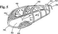 図5に示されているように、空気は、送込バルブ24、26から供給され、好ましくは溝縁接続52の形態をとるのが好ましいダクトを介して管状通路46.48を通って流れる。当業者には認識されるであろうが、ガス通路46、48は、送込バルブ24、26から溝縁接続52を通って流れる空気によって膨張状態となり、医療患者36を隔離するチャンバまたはカプセル50を規定する半剛体構造を形成するように溝縁52に連結されている。医用グレードの空気、すなわち、酸素が豊富な空気または酸素は、通気装置(図示せず)を介して送込バルブ24、26へ、そして最後には患者36に供給される。そのような酸素が豊富な空気または酸素は、機内に搭載された酸素生成システム、加圧酸素ボンベ、またはその外部供給源を介して通気装置に供給し得る。説明したように、さらに、担架12内には、当業者には理解されるように、空気を担架上部に吸い込むためのファンと、空気を化学、生物および放射線汚染物から濾過するためのフィルターとからなる環境制御システムが含まれているのが好ましい。さらに、空気が通気装置から、給気管24、26、通路46、48を通って、患者36の上まで進むときに、空気を所望の温度に調節する空気温度制御装置を具備するのが好ましい。