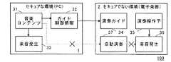 セキュアな環境においてのみ利用可能な音楽コンテンツを利用して、外部の電子楽器等に備えられている演奏ガイド機能を実行しようとした場合、上記のように記憶媒体経由では電子楽器等に音楽コンテンツを供給することが出来ない。そこで、セキュアな環境からリアルタイムに演奏情報を電子楽器等に送信出来るようにして、演奏ガイド機能を実行することも考えられるが、外部で演奏情報を録音されてしまい、著作権保護上、好ましくない。従って、セキュアな環境においてのみ利用可能な音楽コンテンツを演奏ガイドに利用することはできなかった。 When trying to execute a performance guide function provided in an external electronic musical instrument using music content that can be used only in a secure environment, the music content is transmitted to the electronic musical instrument via a storage medium as described above. It cannot be supplied. Therefore, it may be possible to transmit performance information to an electronic musical instrument or the like in real time from a secure environment and execute the performance guide function. However, the performance information is recorded externally, which is not preferable for copyright protection. . Therefore, music content that can only be used in a secure environment cannot be used as a performance guide.