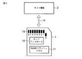 また、NAND型フラッシュメモリ用のインタフェースでは、フラッシュメモリ11に対するコマンドとデータが同じI/O線を共用して通信されている。このように、ホスト機器2内のホストコントローラとメモリカード1とが通信するインタフェースと、フラッシュメモリ11とカードコントローラ12とが通信するインタフェースとは異なる。  In the NAND flash memory interface, commands and data for the