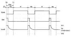 スイッチング素子SWの開閉は、制御回路30から供給される制御信号SINIによって制御される。図4に示されるように、制御信号SINIは、初期化期間PINIの始点T0から所定の時間長(初期化期間PINIよりも短い時間長)が経過するまでの期間(以下「第1期間」という)P1と、各ブランキング期間Hbの始点から所定の時間が経過するまでの期間とにおいてハイレベルを維持し、これ以外の期間にてローレベルとなる信号である。スイッチング素子SWは、制御信号SINIがハイレベルを維持する第1期間P1および各ブランキング期間Hbにてオン状態となり、これ以外の期間においてはオフ状態となる。  Opening and closing of the switching element SW is controlled by a control signal SINI supplied from the